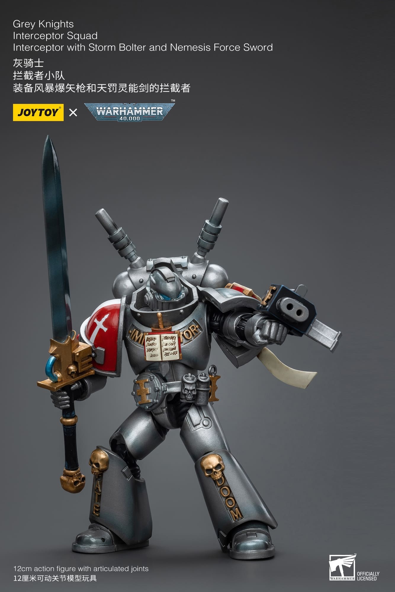 The JoyToy Action Figure Warhammer 40K Grey Knights Interceptor Squad Interceptor with Storm Bolter and Nemesis Force Sword is an intricately designed collectible figure inspired by the Grey Knights, an elite Space Marine chapter in the Warhammer 40,000 universe. This figure showcases meticulous detailing, capturing the iconic armor and weaponry of the Grey Knights. A must-have for Warhammer 40K enthusiasts and collectors, this action figure allows fans to display the heroic and formidable presence of the Grey Knights in their collection, embodying the eternal defenders against the forces of Chaos in the grim darkness of the far future.