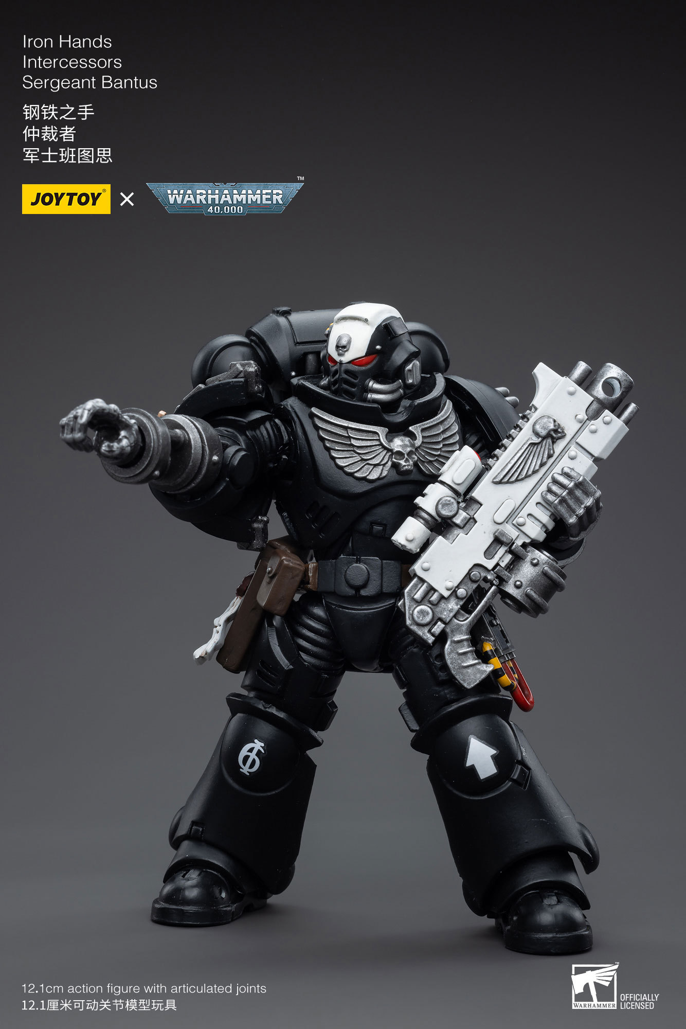 The JoyToy Action Figure Warhammer 40K Iron Hands Intercessors Sergeant Bantus is a highly detailed miniature figurine from the popular tabletop wargame Warhammer 40,000. It is designed to represent a fully equipped Intercessor, armed with pistols and scabbards, rifle, and wearing power armor. The figurine comes with several customizable options, including different head and weapon options, allowing players to personalize them.
