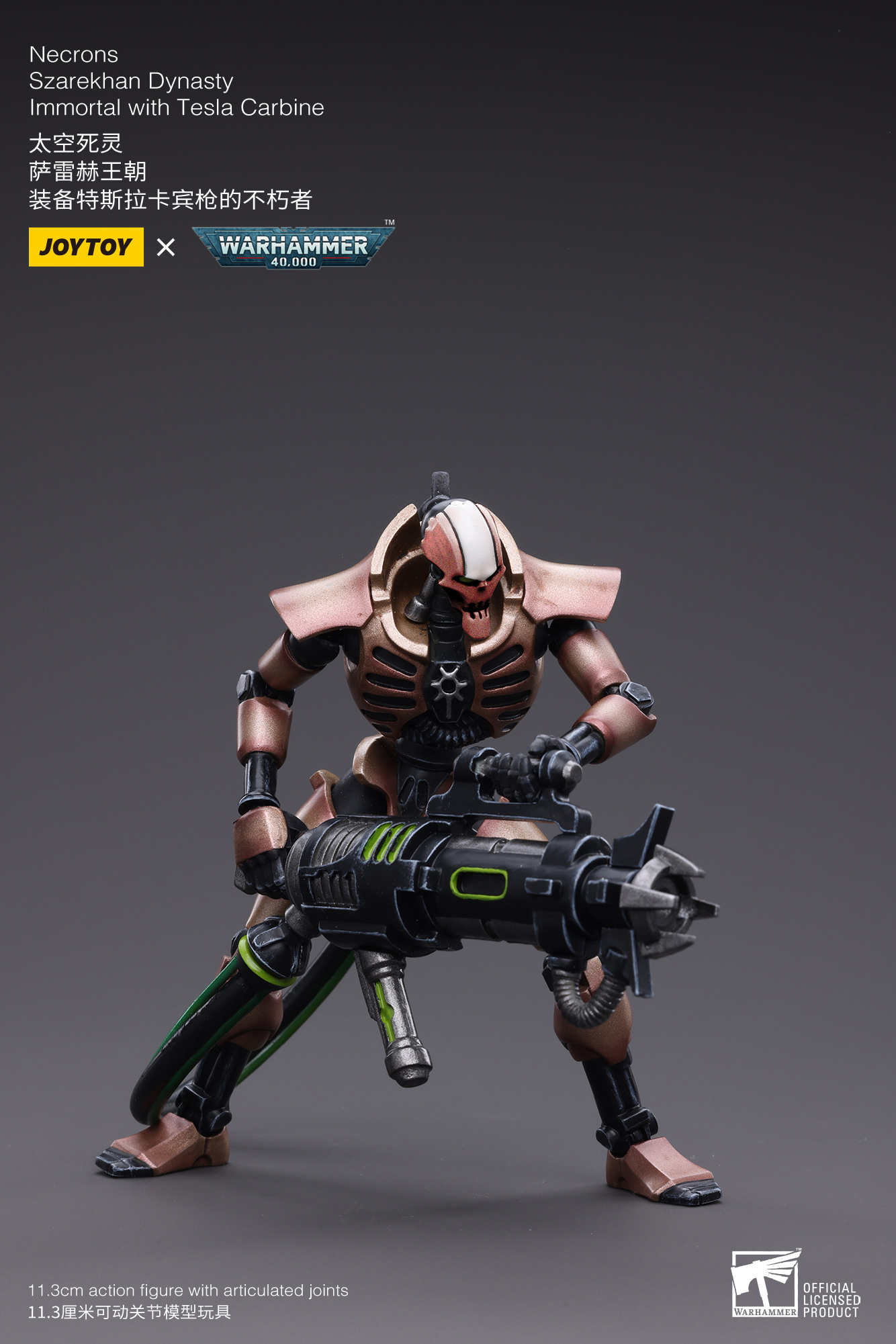 Collaborating with GameWorkshop, from JoyToy, we introduce JoyToy Action Figure Warhammer 40K Necrons Szarekhan Dynasty lmmortal with Tesla Carbine figures. As the name suggests, the Szarekhan are the dynasty of Szarekh, the last Silent King. Before the Great Sleep, they were considered far and away the most prestigious and influential dynasty.